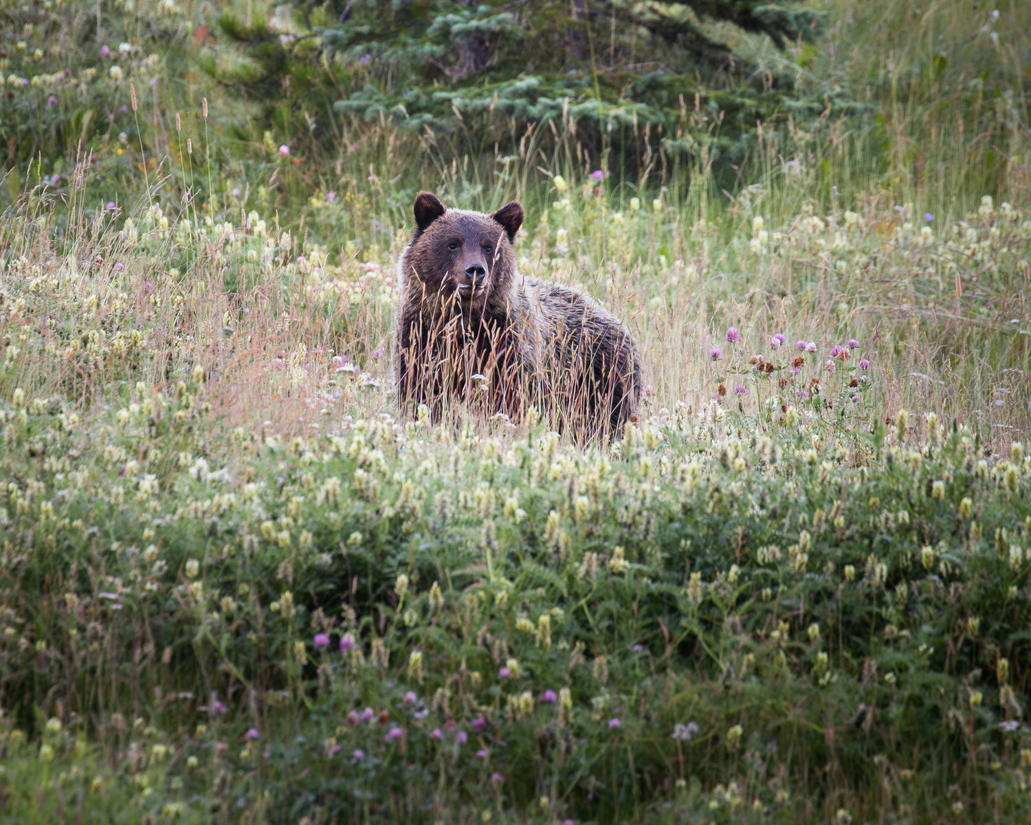 A big grizzly cub standing in the tall grasses and wildflowers.