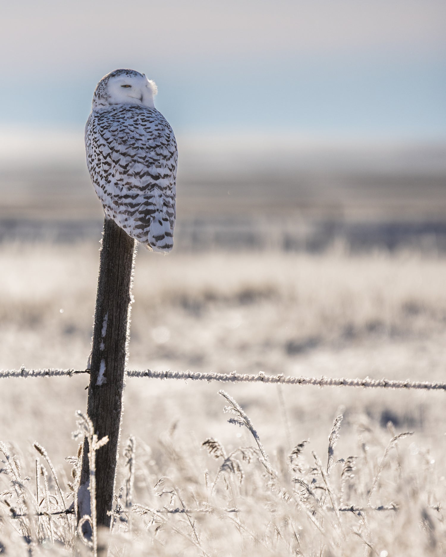 Snowy owl backlit in the frost